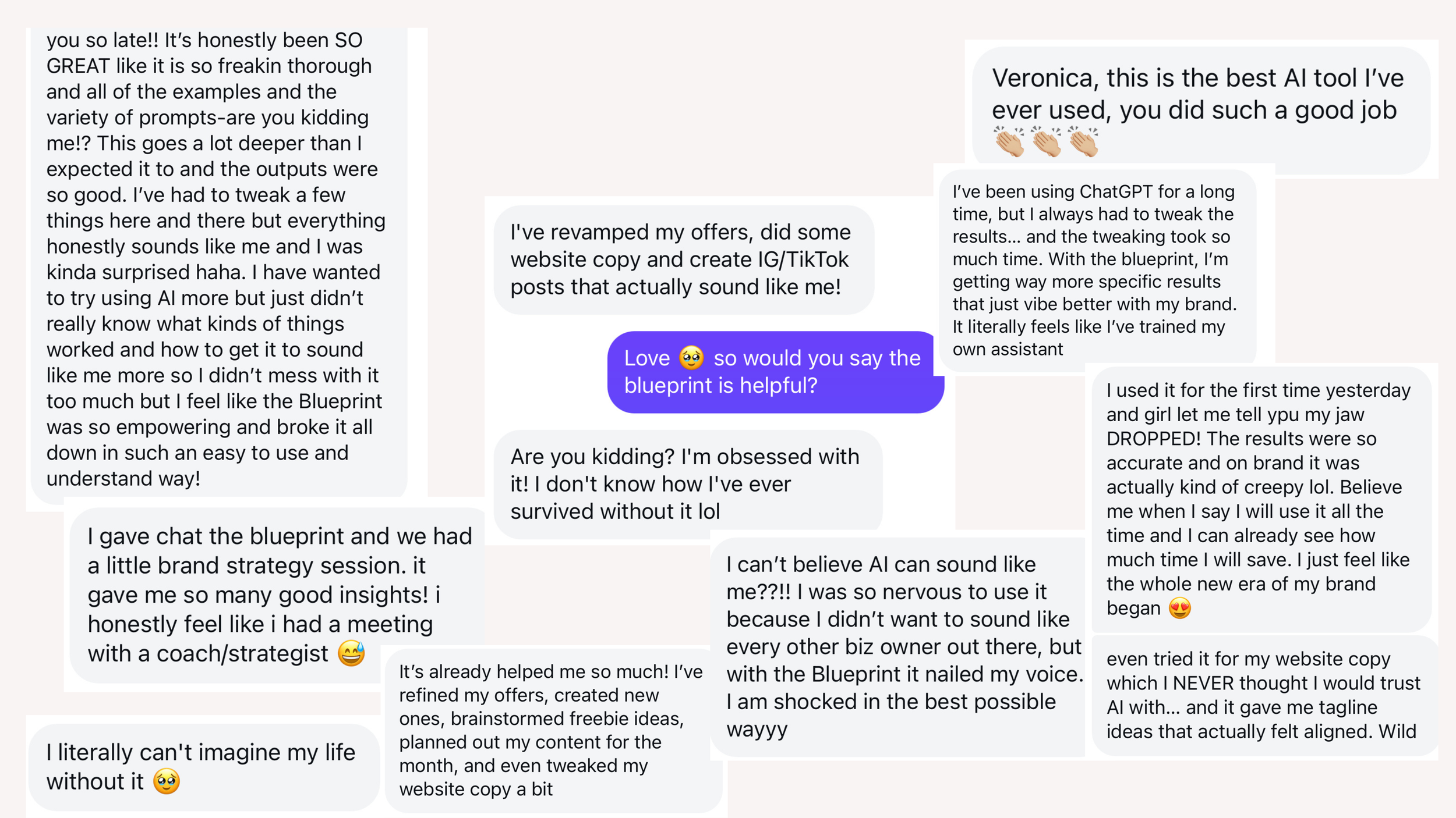 Fill in your Blueprint, upload it into ChatGPT (or your AI of choice), and use my prompts to get aligned, ready-to-use content and ideas.