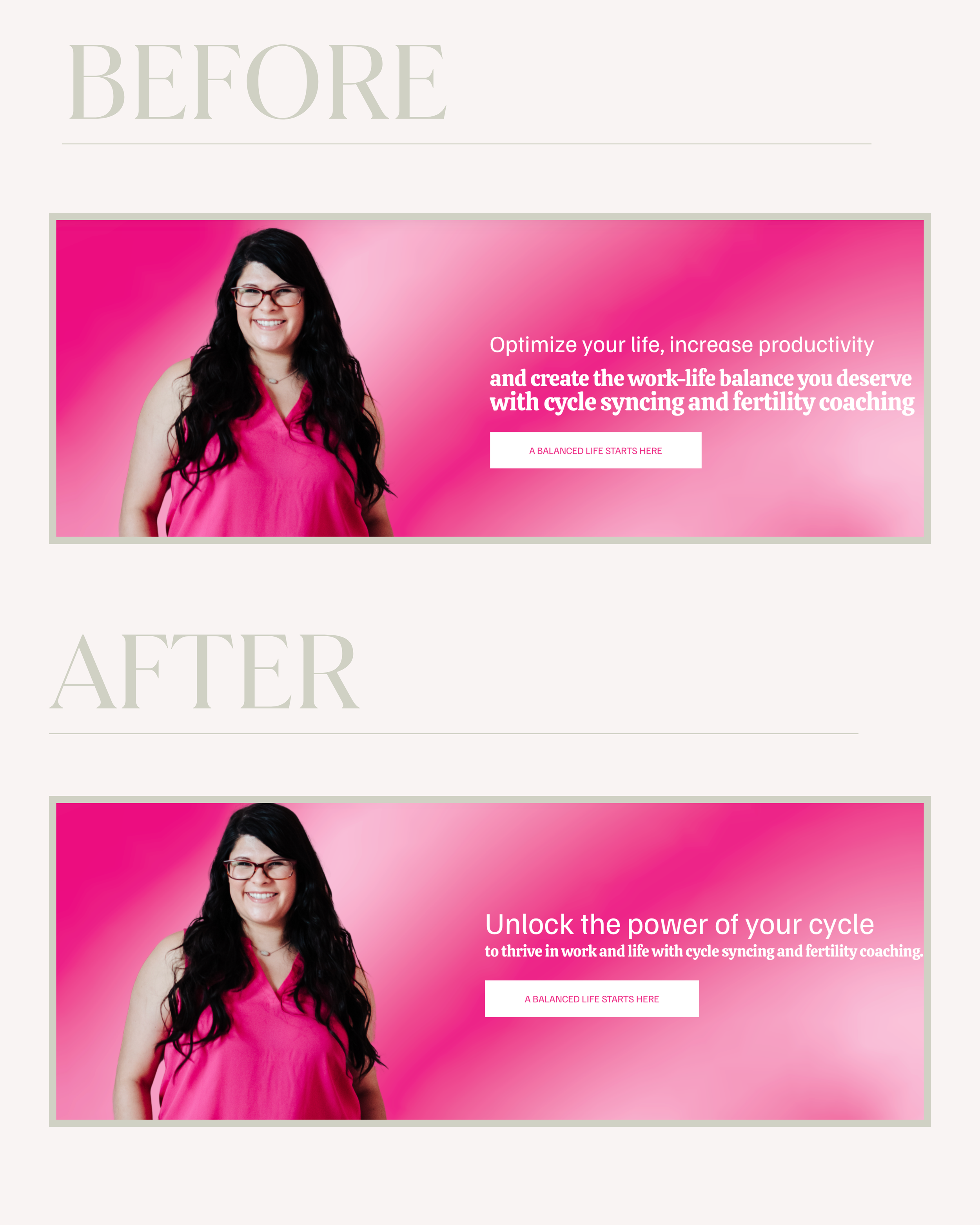 Clearer pain point: Instead of a neutral, factual statement, the new version addresses the struggles that potential clients face (overwhelm, inconsistency, confusion about cycle tracking).