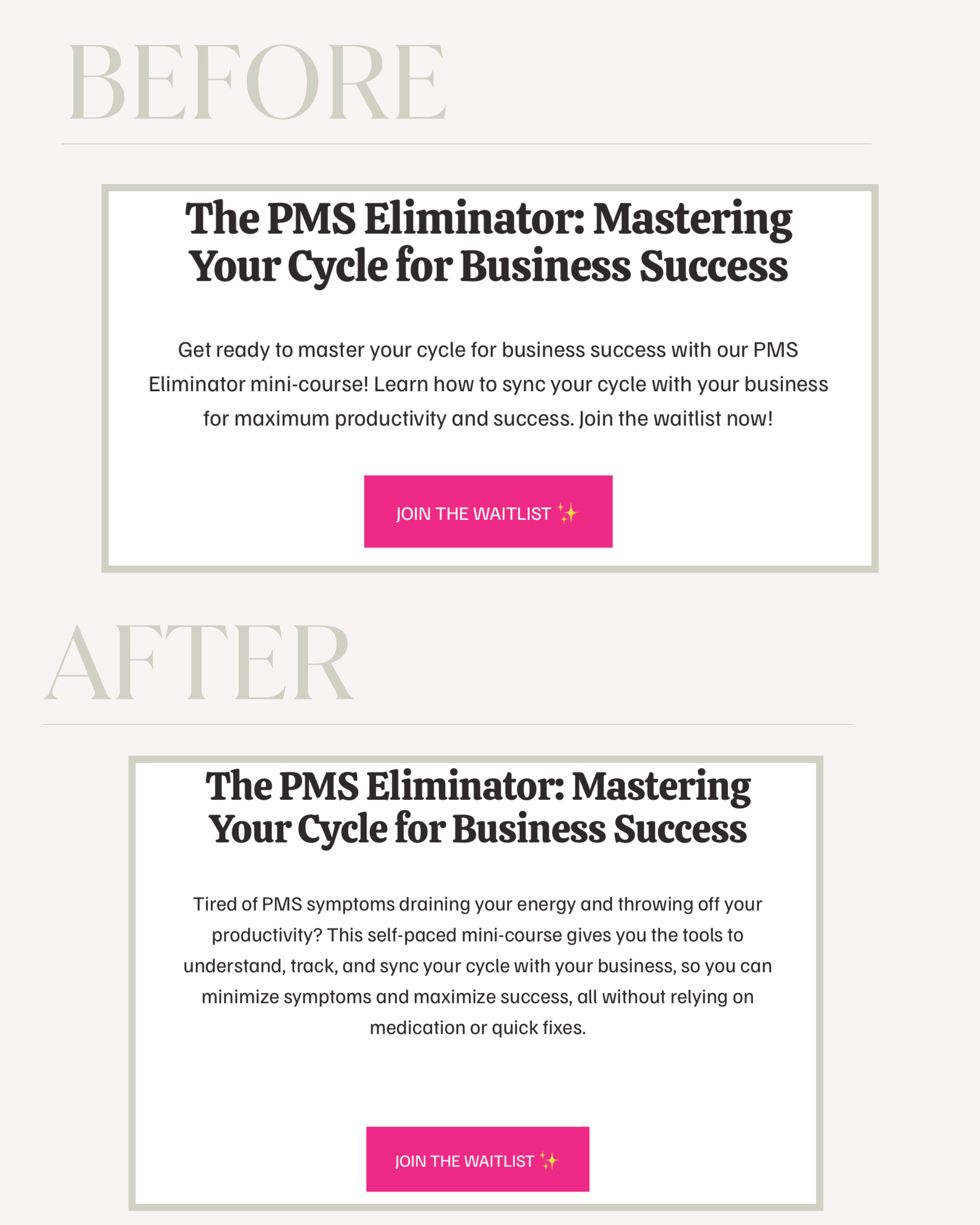 More clarity on what’s included: The before version only mentioned "mastering your cycle," while the after version clearly explains what the course includes and what it helps with (tracking, syncing, productivity, and symptom relief).